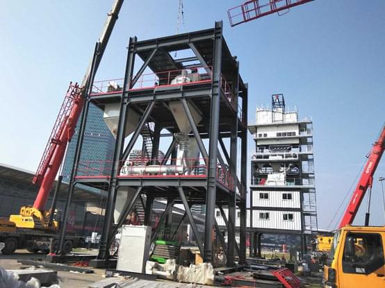 今天是上海寶馬展南方路機展品進場安裝的第五天。天氣晴朗,陽光明媚,安裝團隊干勁十足,安裝工作進展比預期中快,瀝青攪拌設備原生部分主樓安裝完成,緊接著進入熱再生部分吊裝,干混砂漿攪拌設備也安裝至攪拌層。